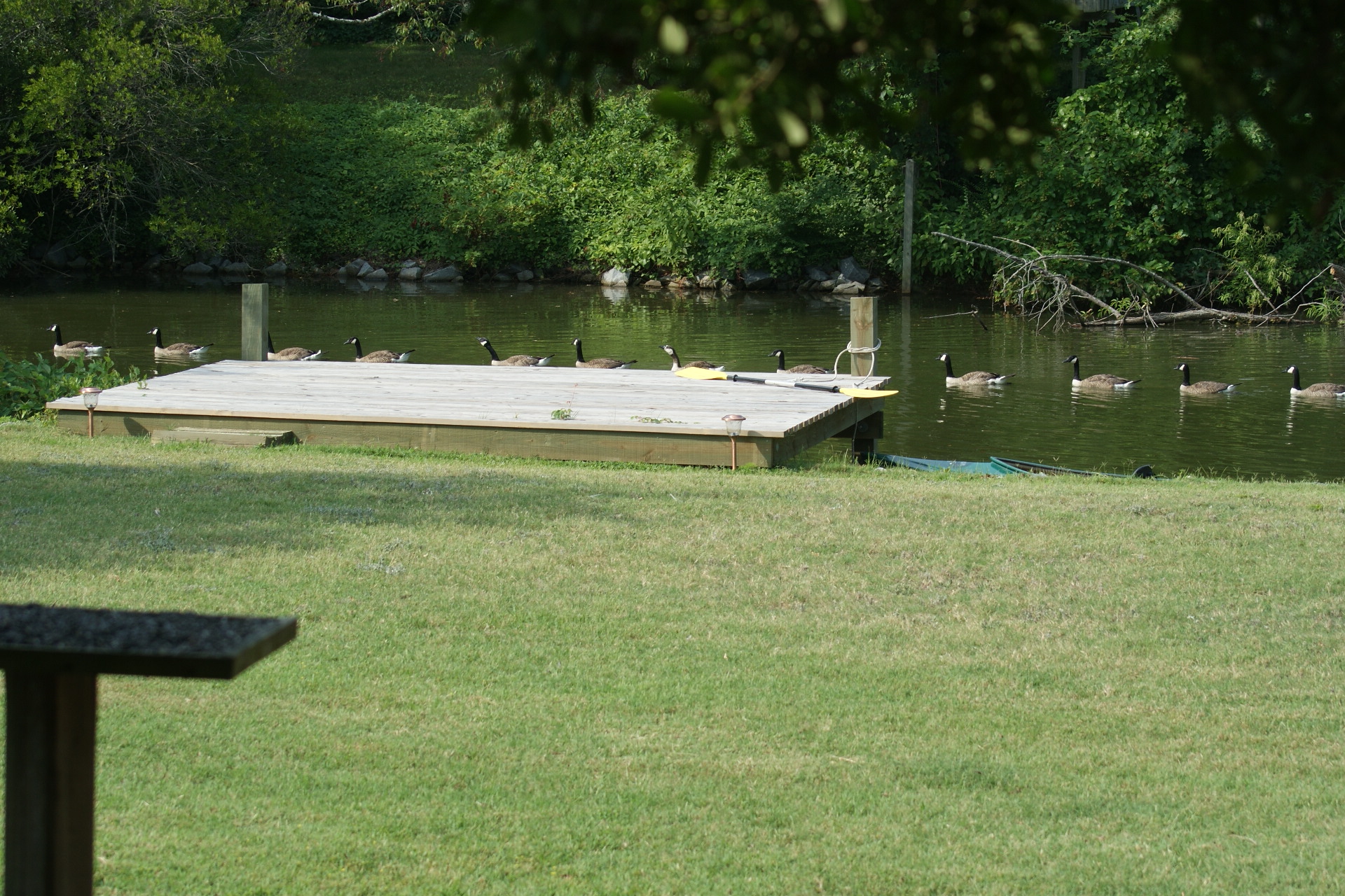 OK. So they’re really geese. But that is the first time I have seen 15 Canada geese swimming in single file past our backyard. I could only get 12 in the shot with the zoom lens on but trust me, there were 3 more. (Click to enlarge)